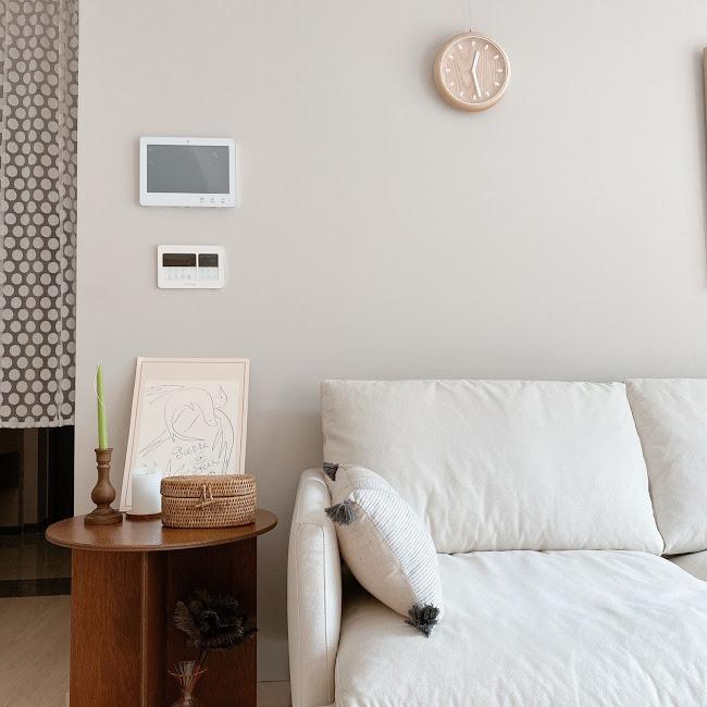 거실은 최대한 심플하게 유지하려고 노력 중이에요. 아이가 있는 집이다 보니 어질러지는 게 일상이라 화이트 패브릭 소파로 전체적으로 깔끔한 느낌을 주려고 했습니다.