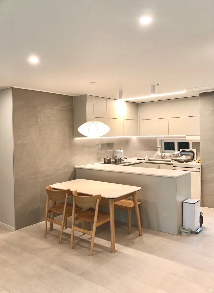 주방은 원래 있던 가벽이 답답해서 철거하고 대면 형 주방으로 만들었어요. 세 가족이 사는 집이지만 저는 수납이 많았으면 해서 상부장이 있는 주방을 고집했고, 냉장고 장도 크게 짰고요.