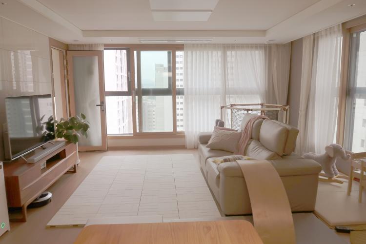 주방을 마주하고 있는 우리 집 거실이에요.