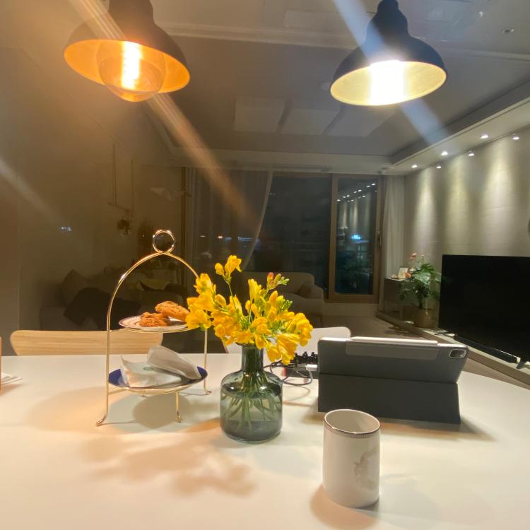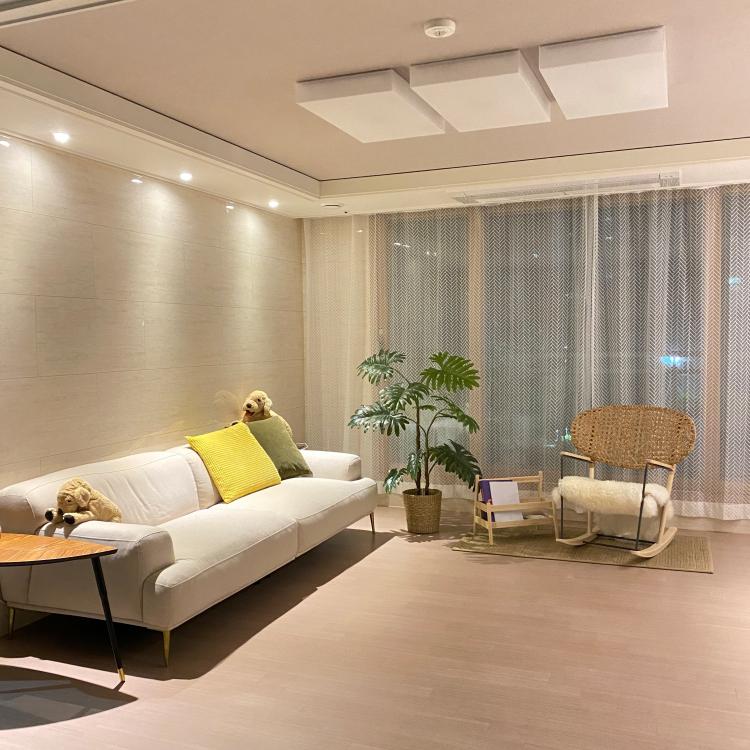 아침 풍경의 거실입니다. 필로티층의 장점이지요! 창밖으로 보이는 아파트 조경이 정원같이 펼쳐져 계절을 느끼기에도, 홈 카페 분위기를 내기에도 참 좋아요! 저곳에 앉아 밖 풍경을 보고 있는 게 힐링이 따로 없답니다. 정말 예뻐요