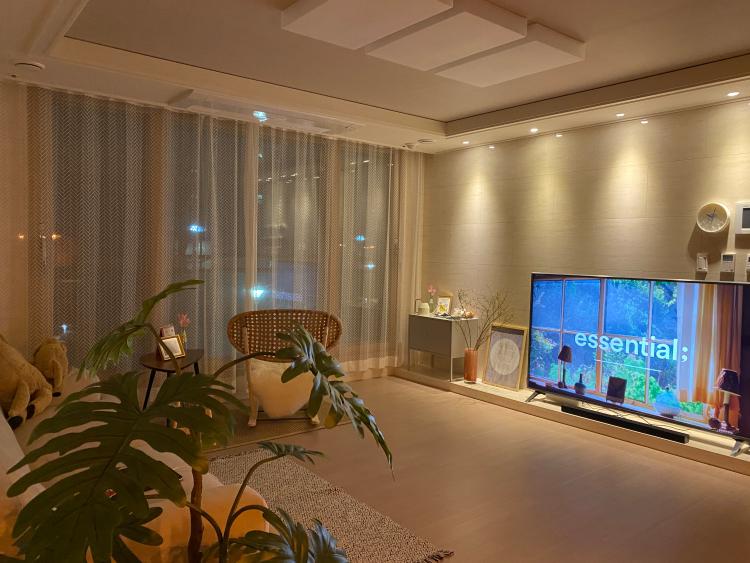 거실에는 큰 모니터를 좋아하는 남편 덕에 별다른 인테리어를 하지 않아도 꽉 차는 느낌이 듭니다. 트인 거실에서는 영상을 틀어놓고 간단한 스트레칭을 하기도 해요. : )