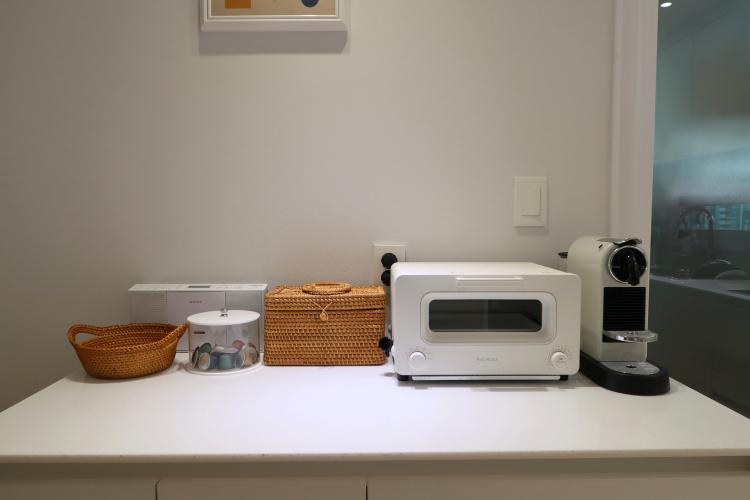 주방 한편에는 소소하게 꾸민 공간이 있어요. 토스트기, 커피 머신, 소품함 등등이 있어요.