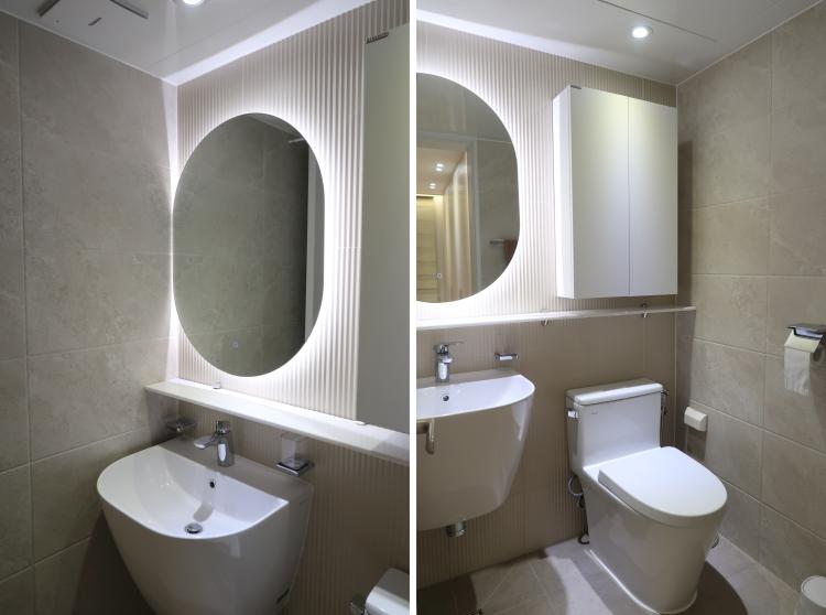 안방 욕실은 크게 욕심내지 않아서, 하고 싶었던 물결 타일만 하고 기본 거울로만 진행하려 했지만 인테리어 사무실에서 간접조명 거울로 추천해 진행해 주셨어요. 하고 나니 더욱 분위기 있는 욕실이 되어 맘에 들어요.