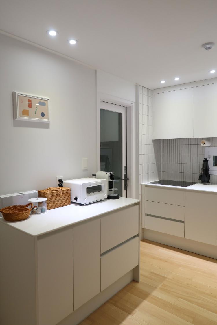 주방은 싱크대나 수납공간이 녹록지 않은 편이였는데요. 벽면 전체에 장을 짜는 건 답답해 보일 것 같아 남편과 상의 후 아일랜드 장으로 했어요. 또 여행 다니며 모아왔던 마그넷을 붙이는 자석판을 꼭 달고 싶어서 냉장고장 옆에 달았답니다.