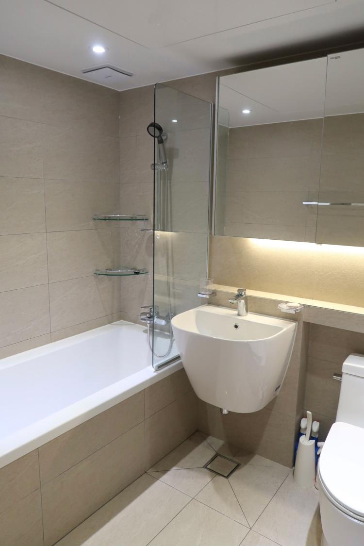 여기는 거실 욕실이에요. 거실 욕실은 바닥과 벽의 타일을 업그레이드해 진행했어요. 덕분에 더욱 고급스러운 분위기를 풍겨요.