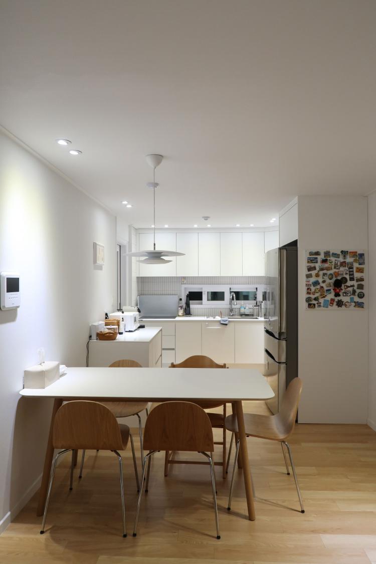 전체적으로 화이트톤으로 맞췄지만 따뜻한 분위기도 공존하길 바라서 마루와 가구는 오크색으로 맞췄어요.