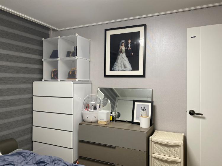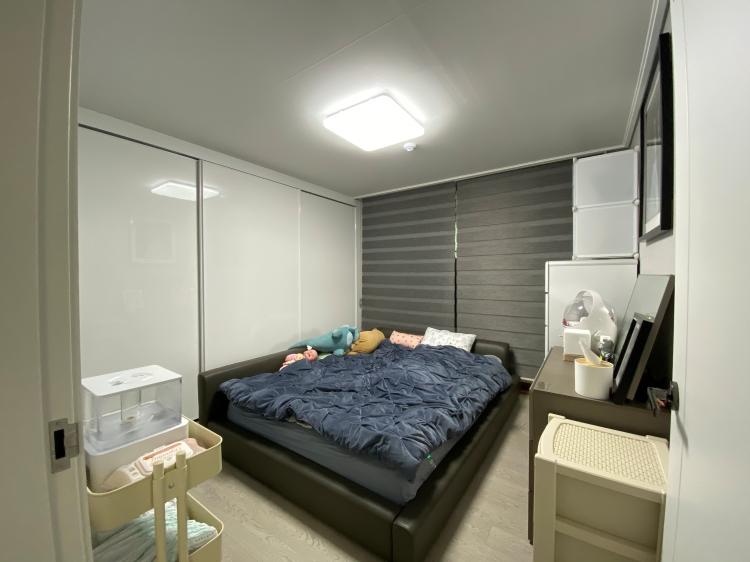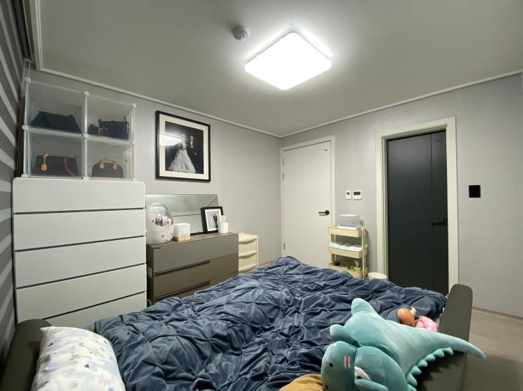안방에도 보시면 거의 그레이&화이트톤으로 꾸며져 있어요. 아이 방에서 따로 저와 아이가 함께 자는데 이사 오고 생활해보니 외풍이 심한 곳이라 아이 방이 너무 춥더라고요. 그래서 안방에선 저와 아이가 생활 중이에요.