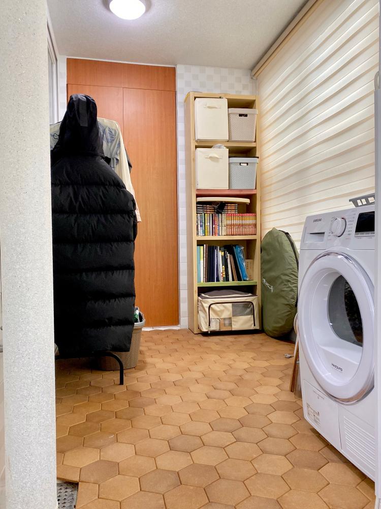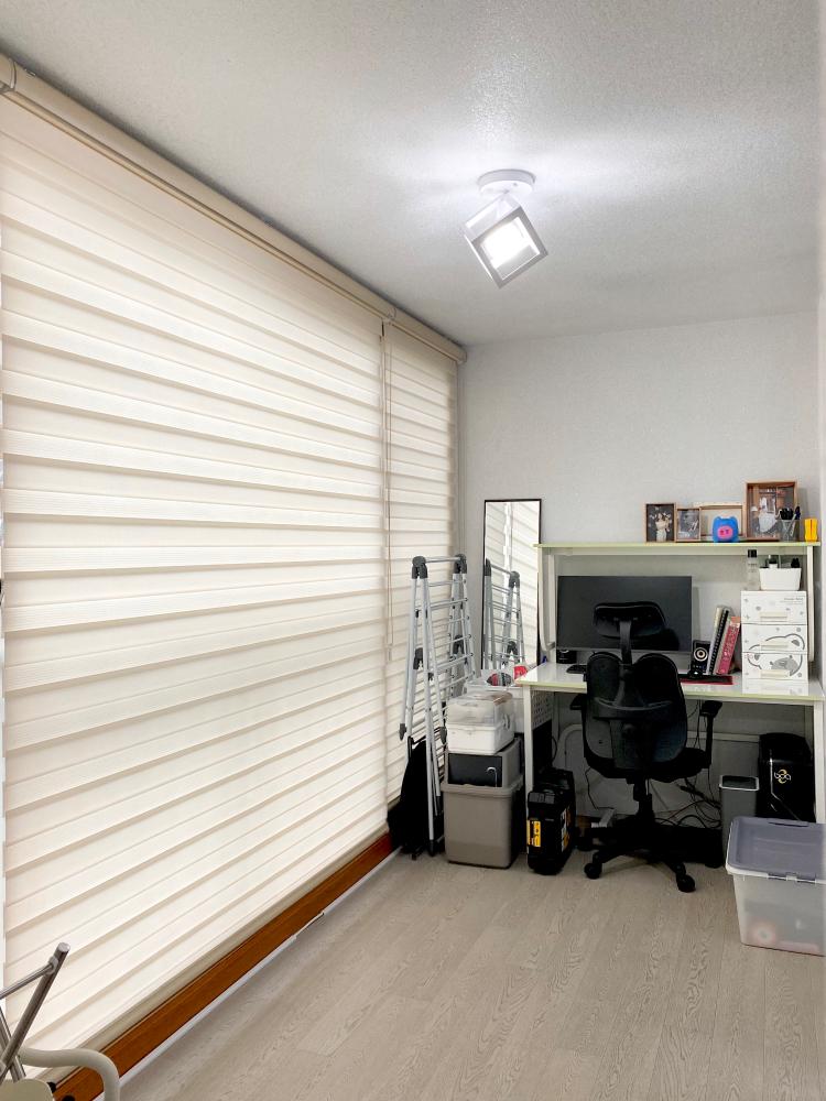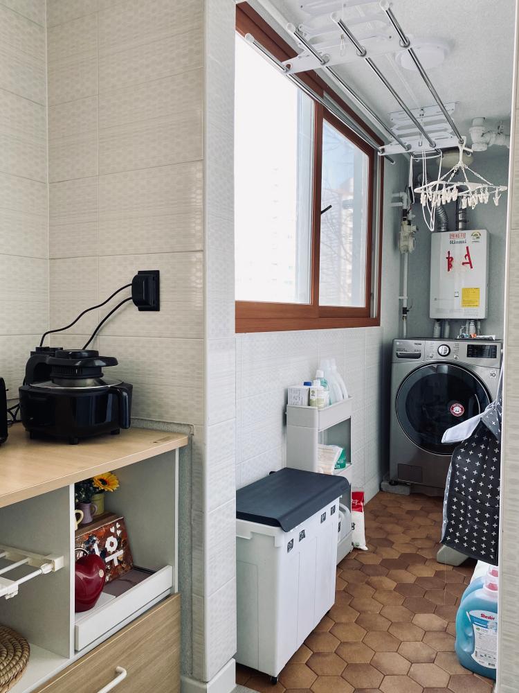 안방 쪽 베란다는 건조기를 놓아주고 데크를 깔아서 물 빠짐이 쉽도록 해놓았어요. 아이 집과 자주 쓰지 않는 짐은 붙박이에 정리해 두었고요. 여기 또한 주방 베란다와 같이 밝고 따뜻한 톤의 블라인드를 설치하여 집안의 분위기와는 차별화해두었어요.