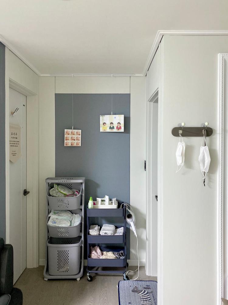 공용화장실 앞에선 아이가 씻고 바로 옷을 갈아입는 곳이라 아이에게 필요한 것을 두어 실용적으로 꾸몄고요.