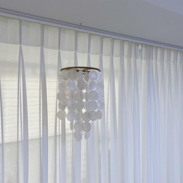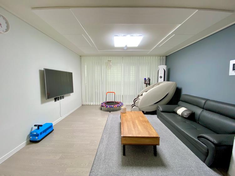 시공 후 쉬폰커텐, 안마기, 티비, 쇼파, 테이블, 러그, 청소기 이렇게 필요한 것 만 놓고 사용중이에요. 소품으로는 시계와 자개모빌정도에요 ㅎㅎ 사진과 액자도 복잡해 보일 것 같아서 걸어두지 못했어요.