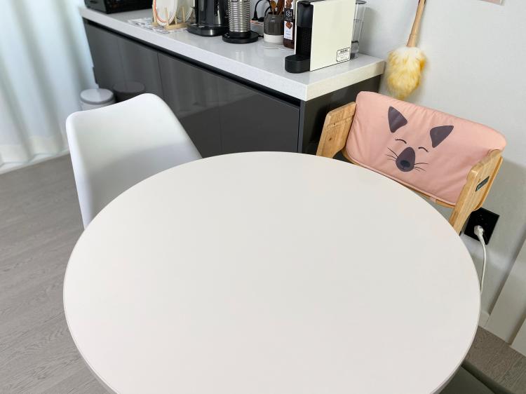 아이가 모서리에 다칠 염려가 없고 넉넉한 800사이즈로 아이와 식사도 가능하고요. 집에서 가장 맘에 드는 가구 중 하나에요.