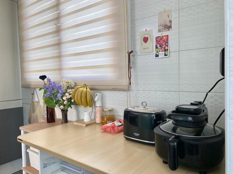 주방 베란다의 색감은 메인 주방과 조금 다르죠? 블라인드를 따뜻한 톤으로 해놔서 베란다 두 곳은 집안과 다른 분위기를 내고 있어요. 블라인드까지 차가운 그레이톤으로 맞추려니 아이가 사는 집에 따뜻함이 없어 보일 것 같더라고요.