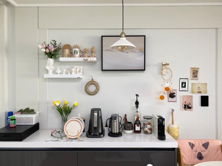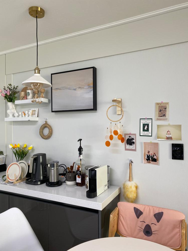 허전했던 벽면엔 신랑이 무지주선반을 달아주니 아기자기한 소품을 올려 더욱 포근해졌구요. 아일랜드장 옆 빈 공간엔 원형테이블을 놔두어 아이와 식사도 하고 낮엔 저만의 홈카페 테이블로 사용중이기도 해요.