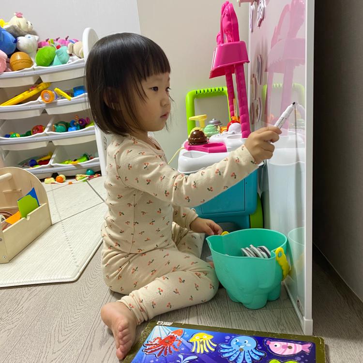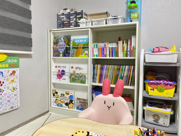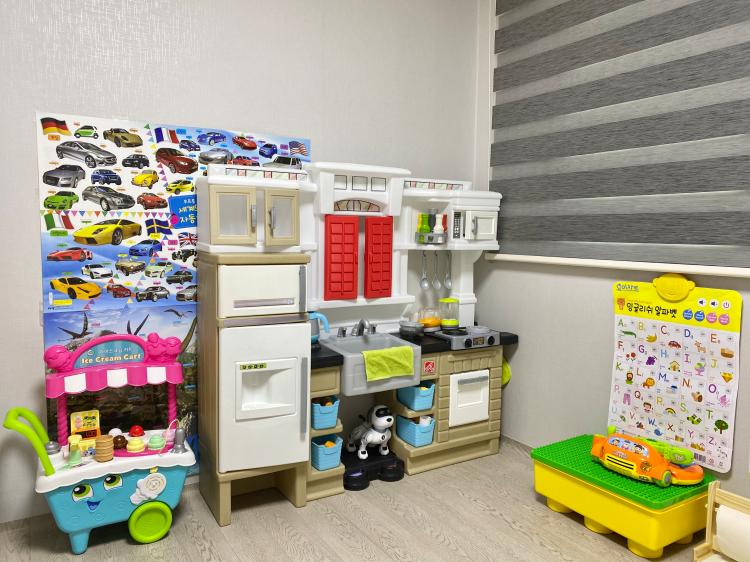 놀이방에도 딱 필요한 것만 놓고 사용 중이에요. 놀이방 잇템은 1. 슬라이딩 책장 2. 주방놀이기구에요.
