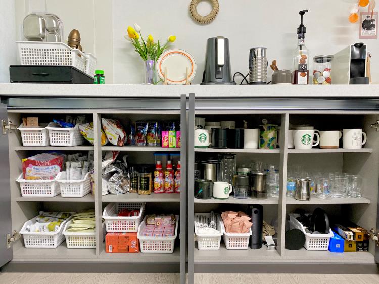 다양한 소품으로 계속해서 변신 중인 아일랜드 장이에요. 아래 하부장 한 편엔 아이가 좋아하는 간식류를, 반대쪽엔 제가 취미로 모으고 있는 머그를 채워 넣었어요.