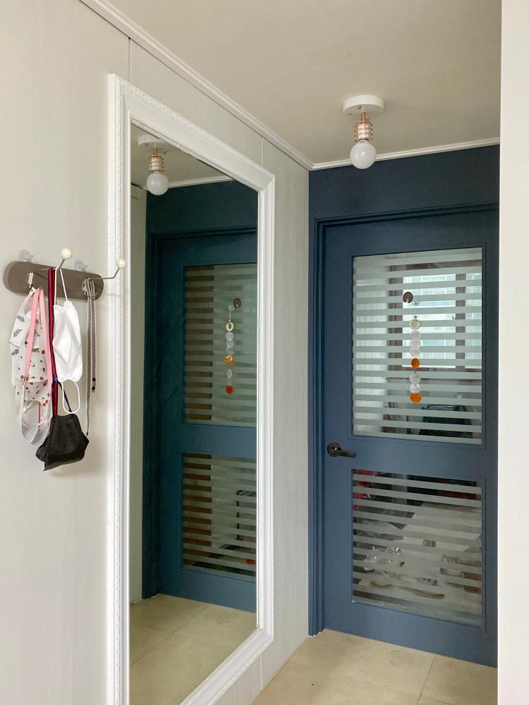 마지막으로 중문 쪽엔 마스크 걸이 소품 걸이를 달아 밋밋하지 않게 하고 중문 색을 짙은 그레이색으로 교체해서 입구를 깨끗하게 만들었어요.
