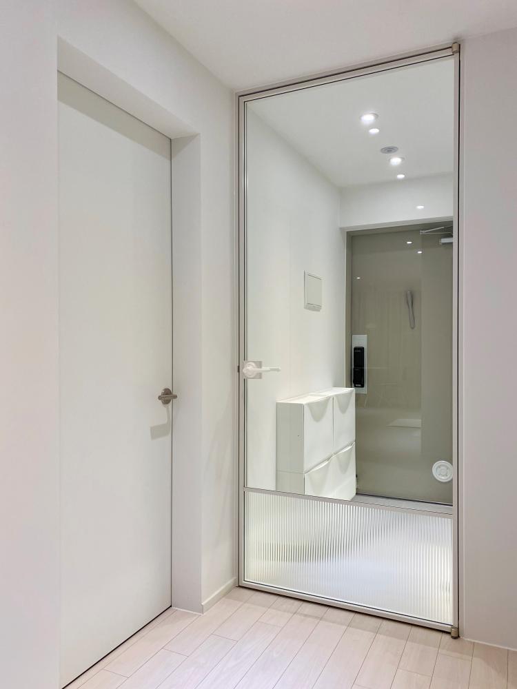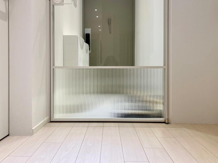 중문의 하단에는 모루 유리로 고시를 주어 현관의 지저분하게 보일 수 있는 신발 등을 시각적으로 차단해 주었어요.