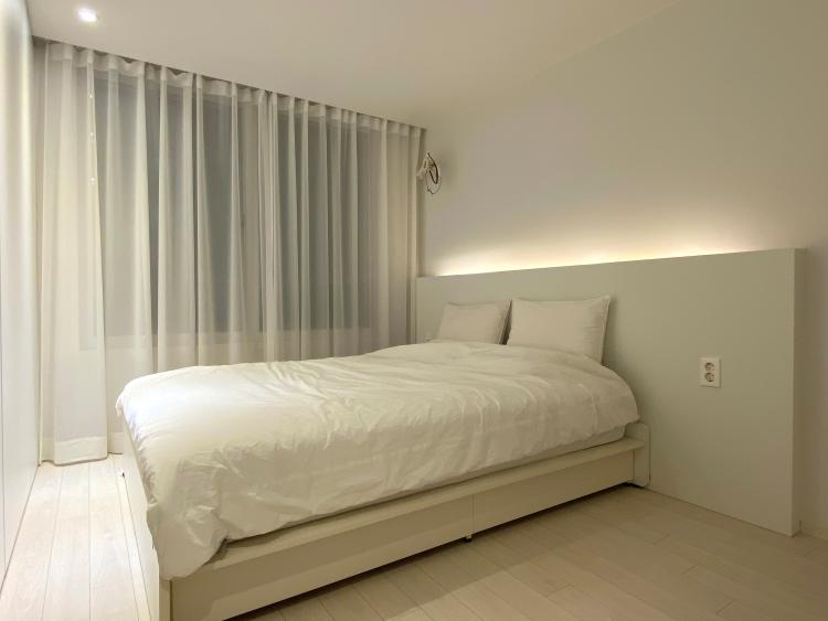 다음은 침실입니다. 침실은 완전한 화이트톤이 구현된 공간이에요. 가구와 가전, 패브릭류 등 일체를 화이트톤으로 맞춰 주어 통일감 있고 넓어 보일 수 있도록 했어요.