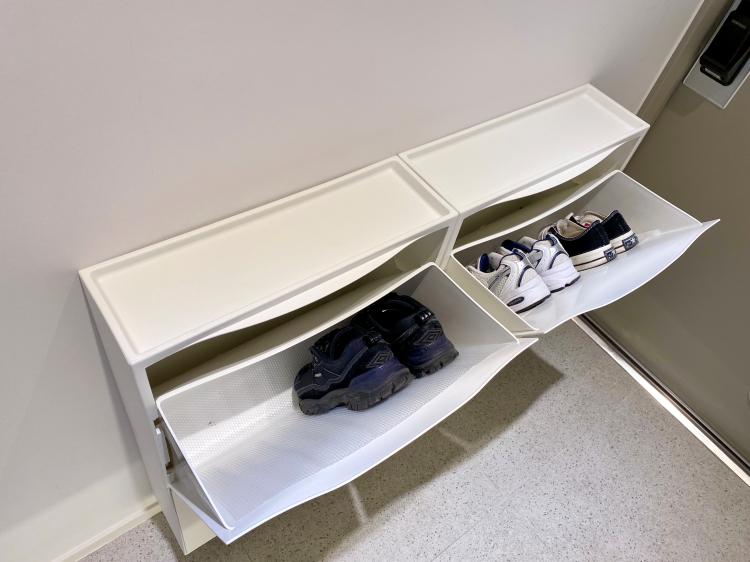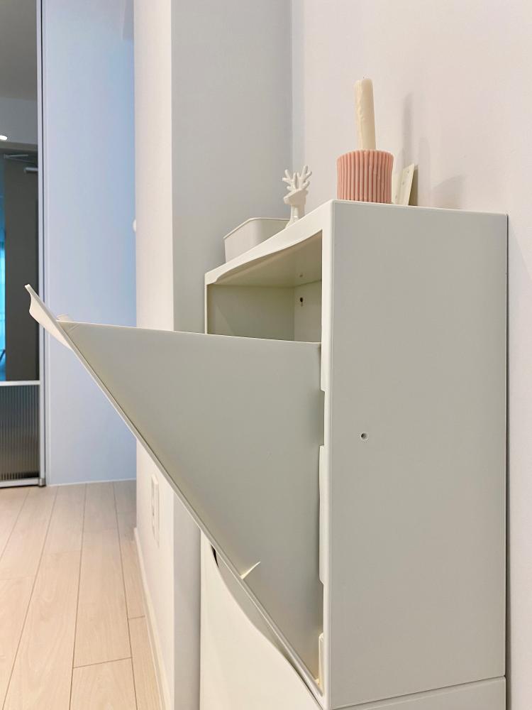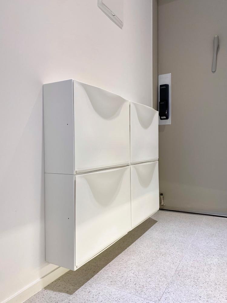현관에도 신발장 맞은편에 '이케아 트로네스'를 추가로 설치하여 간이 신발장으로 활용하고 있어요. 맨날 신는 건 정해져 있는데도 저와 남편 둘 다 신발이 꽤나 많거든요ㅎㅎ