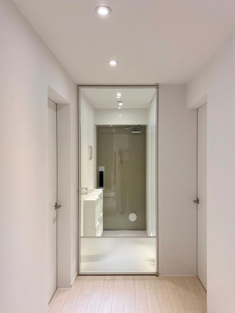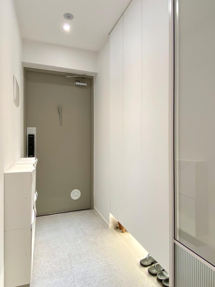 거실과 주방을 지나 현관으로 가는 작은 복도에는 두 개의 방과 화장실이 있습니다. 저희 집은 사진에서처럼 전체 방에 반무문선 시공을 해서 공용 공간에서 볼 때는 벽면과 문이 만나는 부분이 더 깔끔하고 미니멀해 보이도록 공사를 진행했어요. 두 개의 방은 아래에서 다시 보여 드리도록 하고 사진 오른쪽에 보이는 화장실 먼저 소개할게요!