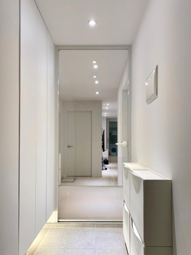 신발장은 하단 띄움 시공을 해주어 아래에는 자주 신는 신발을 보관하고 있습니다. 하단에는 역시 간접조명을 시공해 주었고 센서와 함께 작동한답니다.