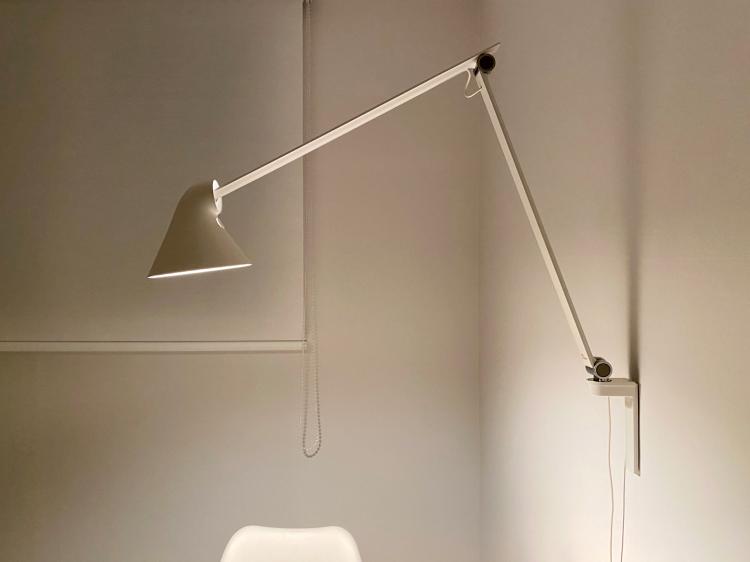 사실 이 데스커 테이블은 이사 오기 전 집에서는 식탁으로 사용하던 제품인데, 이번에 이사를 하면서 책상으로 탈바꿈 시켰어요. 상판에 콘센트도 매립이 되어 있어서 아주 잘 사용하고 있답니다. 테이블 옆 벽면에도 해외 직구한 루이스 폴센 NJP 벽 등을 포인트 조명으로 설치해 주었습니다.