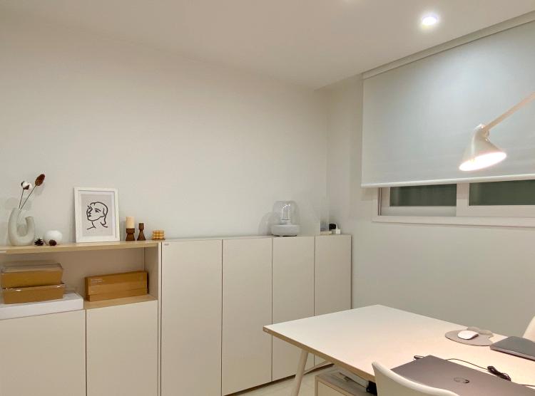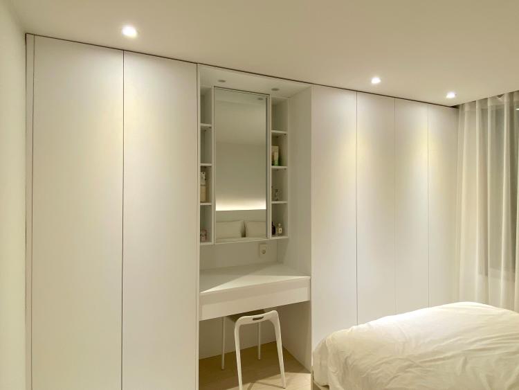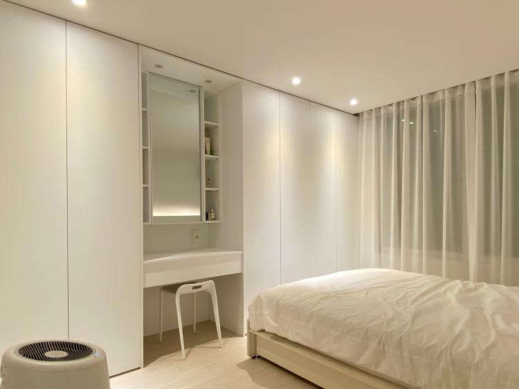 침실에는 붙박이장과 거기 포함된 화장대, 침대와 공기청정기 한 대가 전부인데 전체가 화이트 톤이라 자칫하면 차가워 보일 수도 있을 것 같아 조명은 역시 따뜻한 색감의 전구색 다운라이트로 시공해 주었습니다. 붙박이장 중간에는 화장대가 들어가 있는데 서랍 위 공간이 생각보다 너무 넓게 시공돼서 살짝 아쉽기도 해요.
