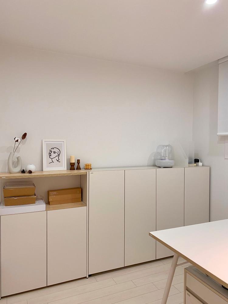 이 장은 원래 도어가 화이트 하이글로시 소재의 제품이었는데 이번에 이사를 하면서 무광 재질의 필름지를 입혀 더욱 깔끔하게 만들어 줬답니다. 내부 구조가 여러 형태가 있어서 서랍장과 키 큰 장 등을 조합하여 사용하고 있어요.
