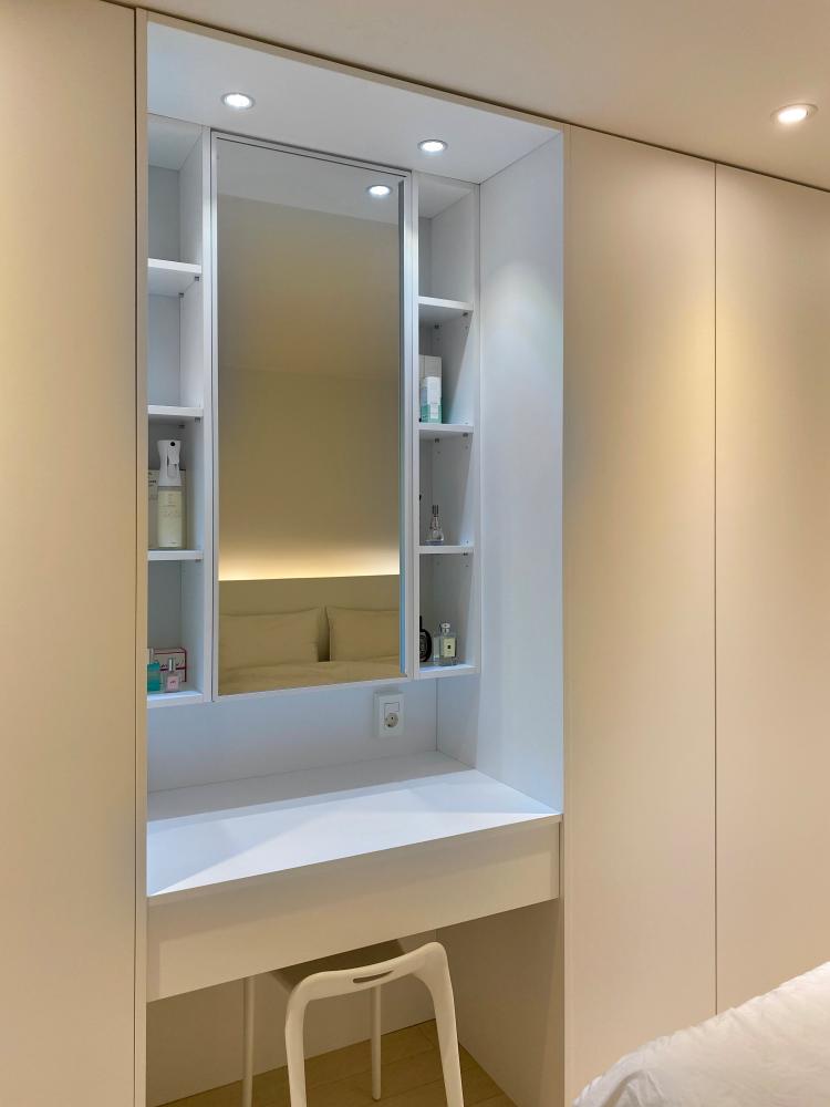 화장을 하는 공간이라 화장대 윗부분에만 밝은 주광색 매입 등을 넣어 주었답니다. 화장대 선반에는 향수와 같이 예쁜 것들만 진열해두고 지저분한 것들은 다 거울 도어 안쪽으로 집어넣어 버렸어요ㅎㅎ