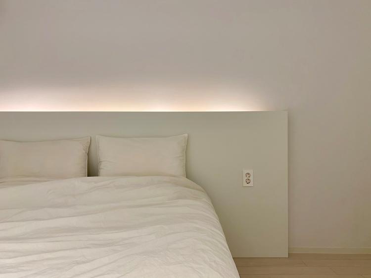 제작한 침대 헤드 윗부분에는 간접 조명을 넣어 은은하게 불을 밝힐 수 있도록 했고, 양쪽에 콘센트도 설치해 주어 휴대폰 충전 등도 가능하도록 했습니다. (반대쪽 콘센트는 스위치부 콘센트라 헤드 위 간접 조명을 켜고 끌 수 있어요!)