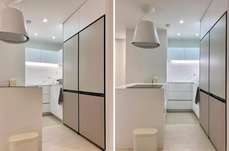 주방 가구 공사 시에 냉장고 장도 새로 짜서 예쁘기로 소문난 비스포크 냉장고도 넣어주었죠. 위 냉장 칸은 무광 스톤 재질의 화이트 톤이고, 아래 냉동 칸은 무광 글라스 재질의 베이지 색상 조합으로 차분한 느낌을 줘서 너무 마음에 들어요 :-)