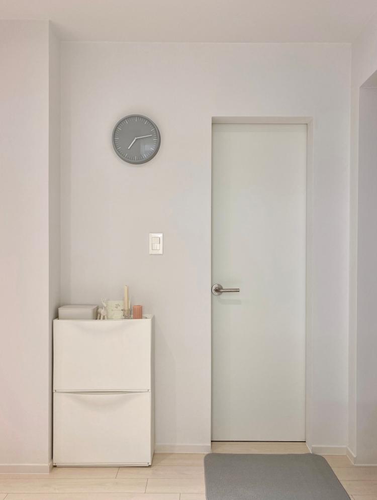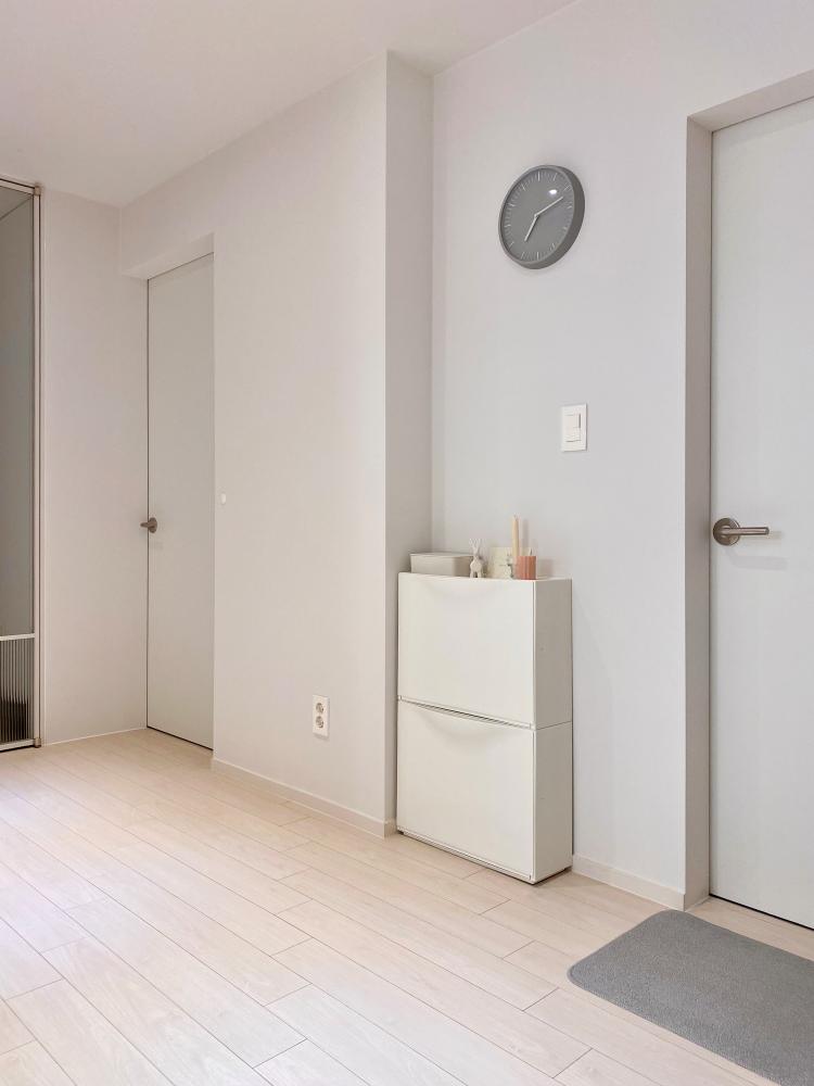 밝은 그레이 톤의 ‘노만 코펜하겐’ 데이 벽 시계와 발 매트로 포인트를 준 이쪽이 바로 화장실 앞 쪽인데요. 화장실 앞 쪽, 벽면이 튀어나온 공간에는 작은 수납장을 배치해 공간을 활용하고 있습니다.