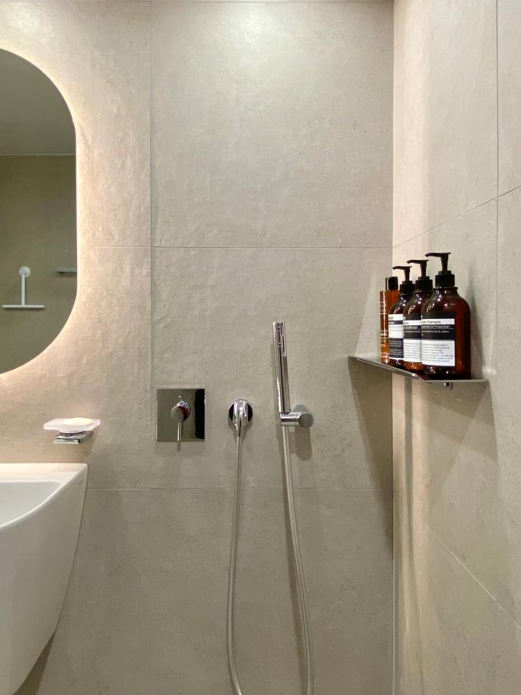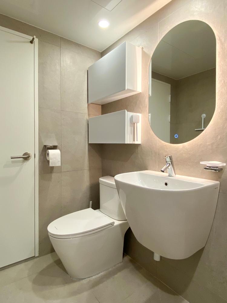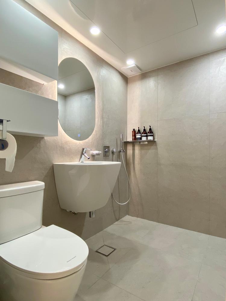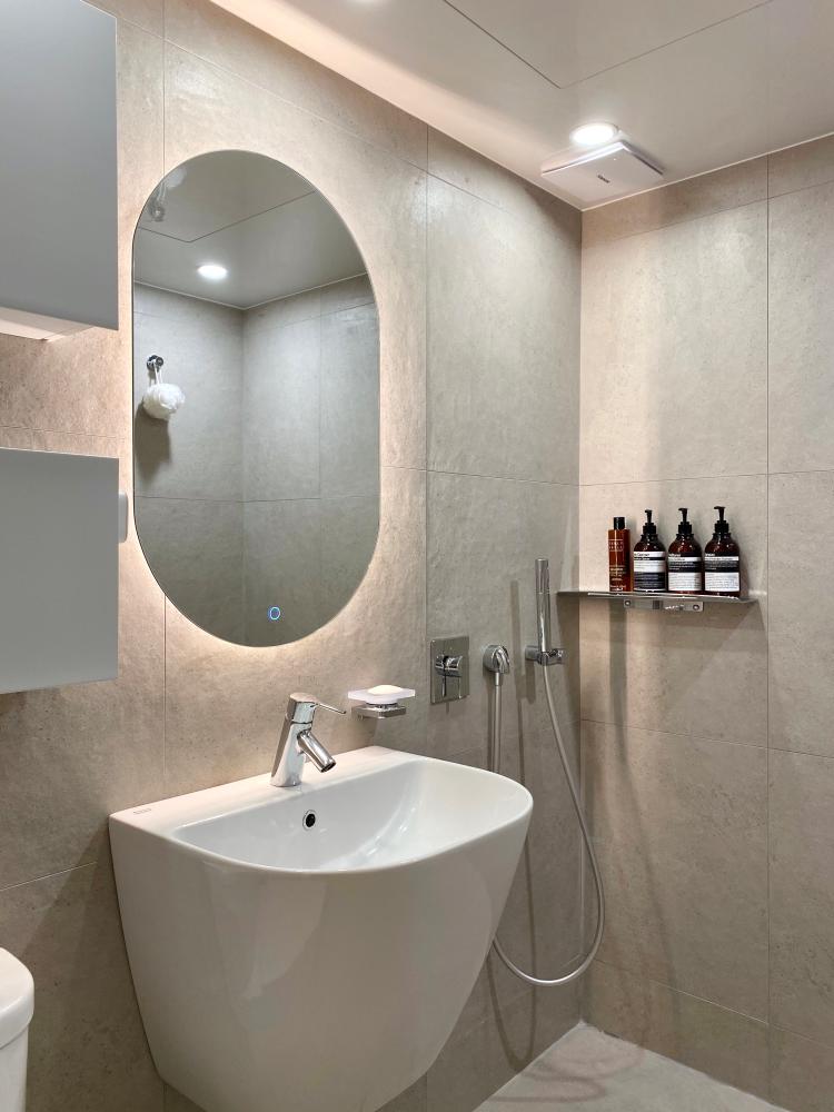 아메리칸 스탠다드 샤워 수전은 매립으로 시공하여 최대한 군더더기 없이 깔끔한 느낌을 주려 했고, 평소 잘 사용하지도 않던 해바라기 수전은 과감하게 빼버렸어요. 샤워 수전 바로 옆에는 선반을 설치해 샴푸와 바디용품 등 욕실용품을 배치했습니다. 일반적으로 많이 사용하는 거울 장은 제가 보기에는 너무 투박해 보이더라구요.. 그래서 욕실 장도 무광 재질의 플랩장으로 달아주었고, 거울은 터치식 조명이 있는 타원형으로 설치했어요.