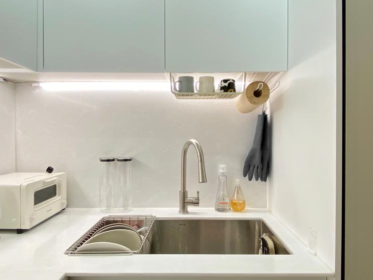 냉장고 옆 안쪽으로는 사각 싱크볼이 있고, 상부 장 아래에 멀티 선반 바스켓을 달아 자주 사용하는 컵과 키친타월 등을 보관하고 있습니다. 조리대 공간은 이것저것 꺼내두지 않으려고 그때그때 정리하며 열심히 노력하고 있어요ㅎㅎ
