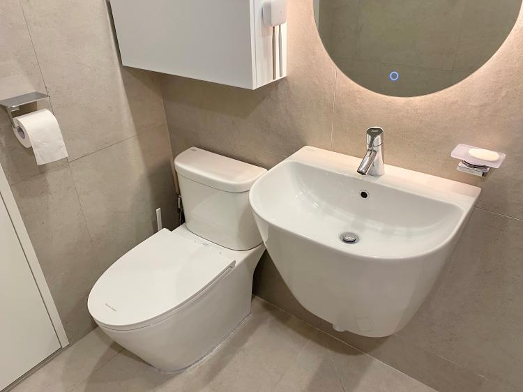 사이즈가 작은 편이라 정말 필요한 것만 넣은 공간이라고 할 수 있겠네요. 딱 기본적인 도기 제품들과 거울, 욕실장, 샤워 수전과 몇 가지 액세서리만 시공했답니다!