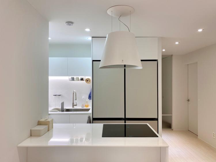 주방 아일랜드에는 삼성 올 인덕션을 빌트인으로 넣어주고, 천장에 화이트 색상의 '엘리카' 탄소 필터 후드를 설치했습니다. 나름 대면형 주방으로 만들어주어 요리를 하면서 남편과 얘기도 하고 TV도 볼 수 있어요ㅎㅎ