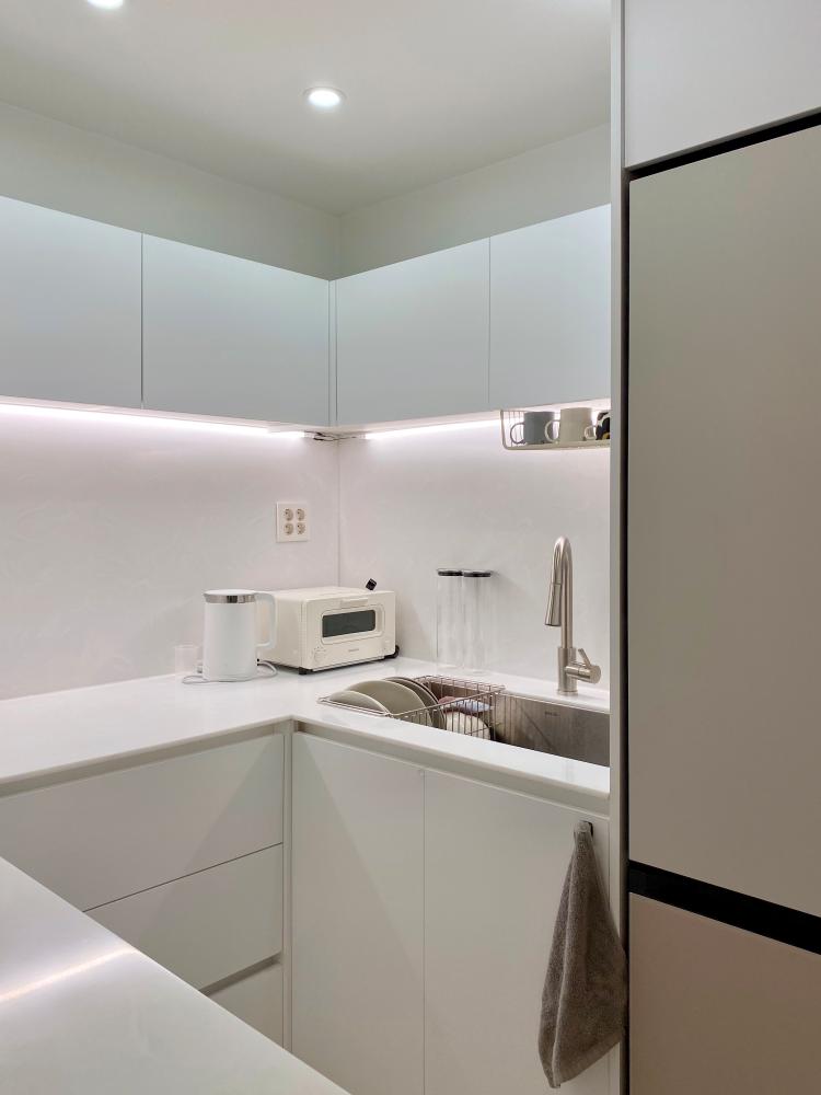 저희 집 주방은 거실과 이어진 구조로 리모델링 전에는 굉장히 심하게 작은 사이즈였어요ㅠㅠ 그래서 정면에 보이는 아일랜드를 새롭게 제작해 주었고, 아일랜드 옆 철거가 불가능했던 비트 앞으로 얕은 장을 짜주어 부족한 수납 문제도 해결해 주었습니다.