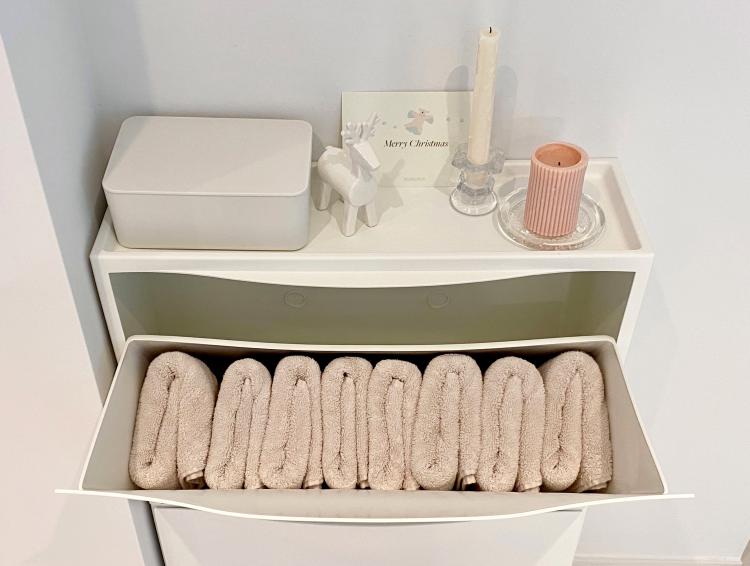 이 수납장은 '이케아'에서 구매한 트로네스라는 제품으로 사이즈가 컴팩트해서 이런 자투리 공간에 놓기 딱인 제품이었어요! 저는 수건장으로 활용하고 있답니다. 수납장 위 하얀 박스 형태 제품은 물티슈 케이스인데 자주 사용하는 물티슈를 지저분해 보이지 않게 보관할 수 있어서 좋은 것 같아요.