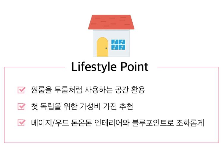 1인 가구가 증가하며 혼자 사는 삶에 대한 로망도 점점 커지고 있습니다. 20~30대가 독립하여 자신만의 공간을 갖추고, 꾸며가는 일이 시간이나 현실적으로 비용적으로도 어려운 것이 사실이죠. 그렇게 때문에 첫 독립 후 가진 나만의 공간에 대한 애정은 더욱 클 수 밖에 없습니다. 처음 시작하는 집꾸미기가 어렵고 막막할 수 밖에 없지만, 자신의 취향과 라이프스타일에 맞춰 필요한 것들만 잘 고른다면 충분히 예쁜 나만의 공간으로 꾸미실 수 있 을거예요! 차세대 라이프스타일관이 작은 원룸 공간도 잘 활용할 수 있도록 가성비 가전으로 첫 독립 생활을 위한 집꾸미기 방법을 제안합니다.