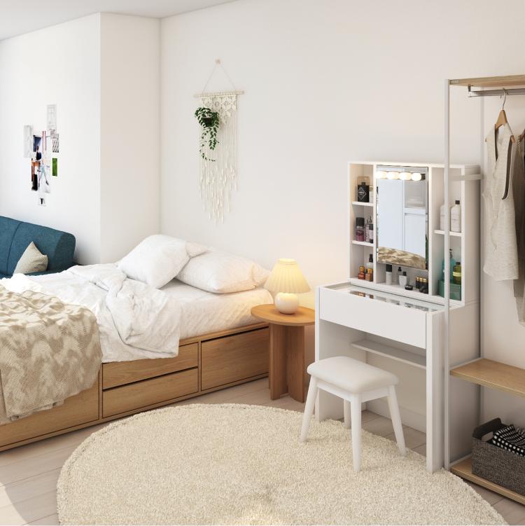 흔히 침대를 창문 쪽으로 놓아야 원룸 공간을 더 넓게 쓸 수 있다고 합니다. 하지만 공간에 따라 생활공간과 침실공간을 적절히 잘 구분한다면 훨씬 더 똑똑하게 공간을 활용할 수 있어요. 살짝 튀어나온 벽면을 활용하여 침대를 중앙에 두니 양 옆 공간을 더 자유롭게 활용할 수 있게 되었어요. 침실을 기준으로 왼쪽은 작업과 일상 생활을 보낼 수 있는 생활 공간, 오른쪽은 화장대와 행거, 옷장을 두고 드레스룸 공간으로 나누었습니다.
