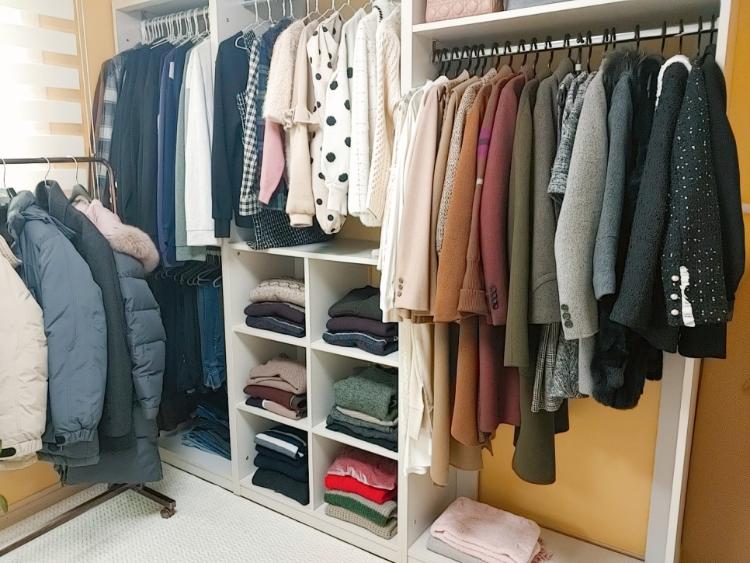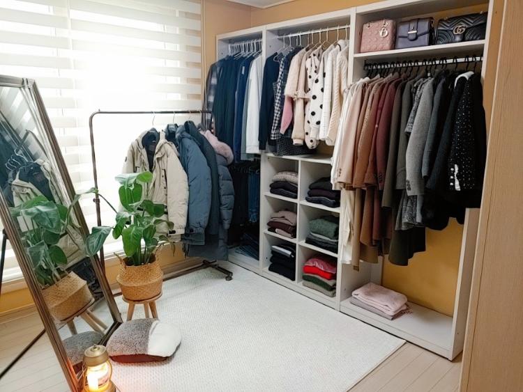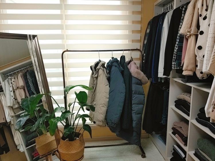 작은방에도 기존에 붙박이장이 설치되어 있어서 레이디가구 이 안 드레스룸 제품을 3개만 구매했어요. 계절에 입는 옷만 걸어두고 깔끔하게 유지하고 싶어서 옷도 많이 정리했어요. 걸려있는 옷들도 입는 옷만 입게 되는데 앞으로 조금씩 더 정리할 예정이에요.