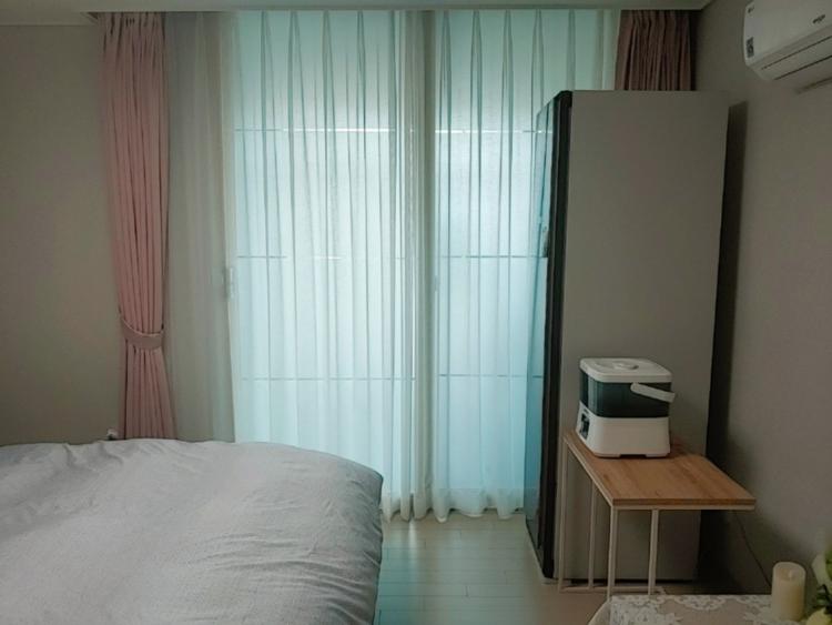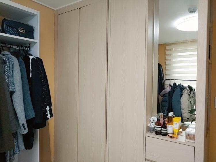 한쪽에 설치된 붙박이장에는 여름 옷을 넣어서 정리하고 화장대 겸 사용하고 있어요. 사실 화장대를 잘 사용하지는 않아요. 거실에서 TV 보면서 상을 이용하고 있어요 :)