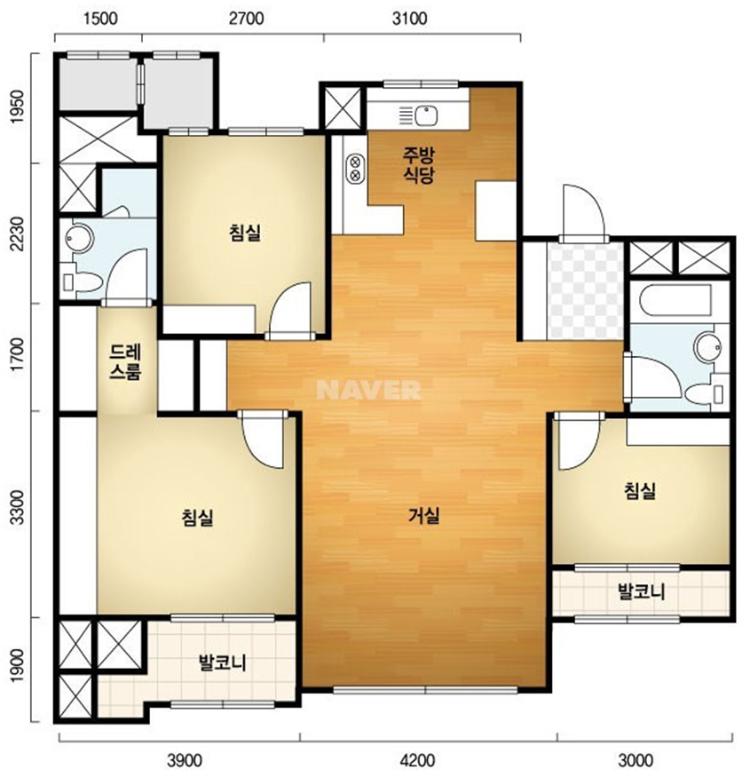29평의 확장형 아파트입니다. 침실 3개와 거실과 주방으로 이루어져 있어요.
