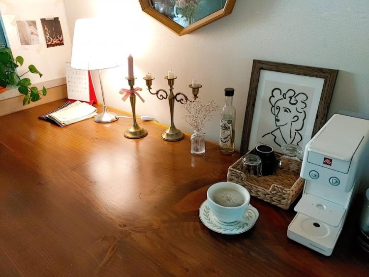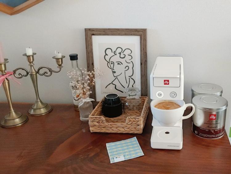 캡슐 커피 머신을 두고 매일 사용하고 있어요. 식탁이 우리 소지품을 놓아두는 공간이 되고 있지만 한 번씩 정리하면서 예쁜 공간으로 남겨두려고 노력하고 있어요.
