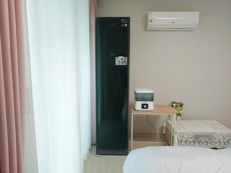 다른 각도에서 보이는 모습이에요. 최근에 하이마트에서 부모님께 세탁기, 건조기를 선물해드리면서 구성 세트인 삼성 에어 드레서는 우리 집으로 오게 되었어요. 음식 냄새가 배었을 때나 미세먼지가 많은 날 사용하면 냄새도 제거되고 먼지도 제거되어서 유용하게 사용하고 있어요.