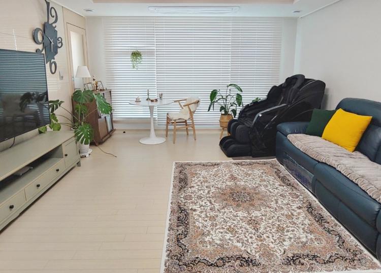 전체적인 거실 모습이에요. 작년에 남편이 가지고 싶어 하던 휴테크 카이 안마의자도 하이마트에서 구매해서 거실 창가에 두었어요.