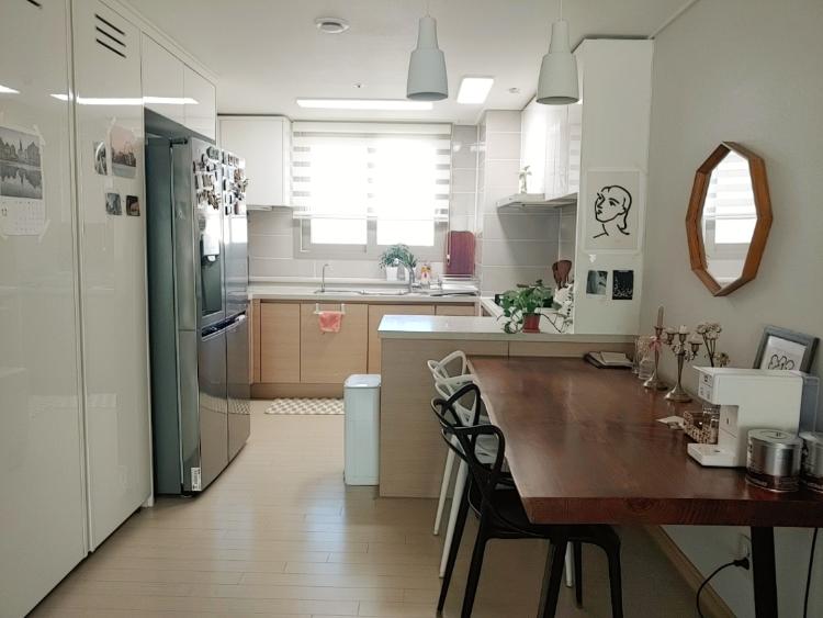 주방의 전체적인 모습이에요. 항상 식탁이나 아일랜드에 뭐든 올려놓는 습관이 있어서 깔끔한 날은 잘 없어요. 오랜만에 깔끔하게 정리해봤어요.