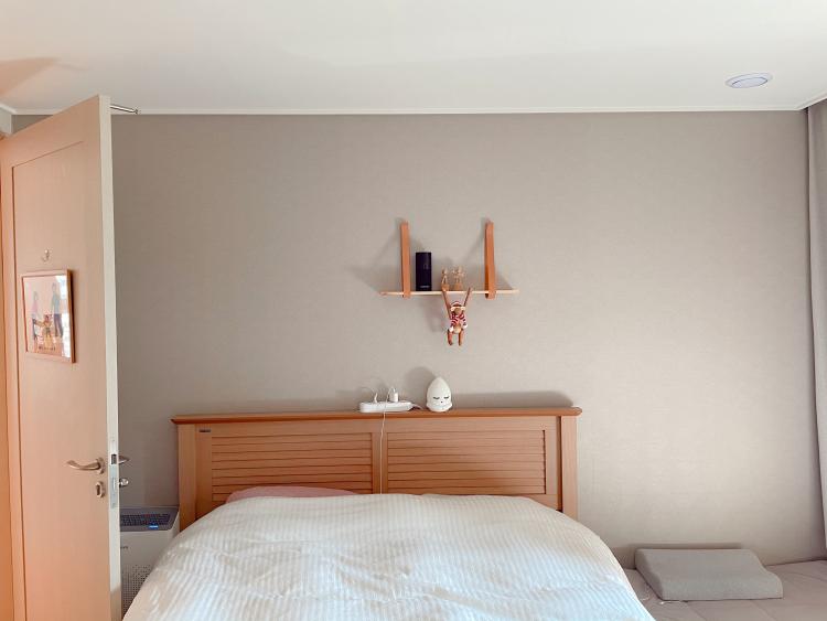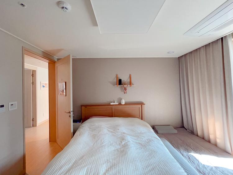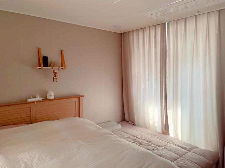 아이방에 있던 침대를 합치면서 프레임은 분해해서 창고에 두었고 매트리스만 가져와서 사용하고 있어요. 사진엔 없지만 반대쪽엔 전부 붙박이장이라 크지 않은 안방이 정말 꽉 찼답니다. 그래서 정말 안방에선 다 같이 잠만 자고 있어요.