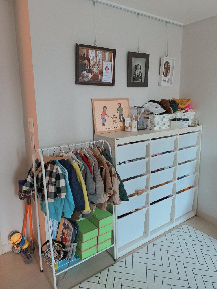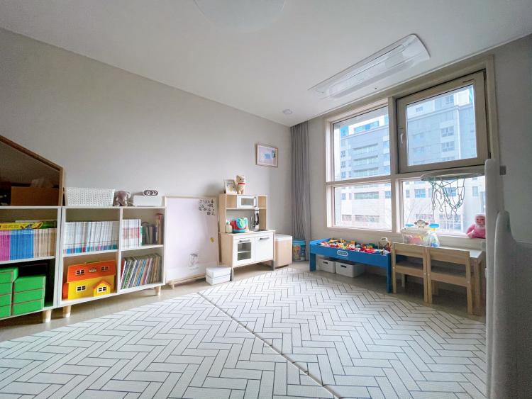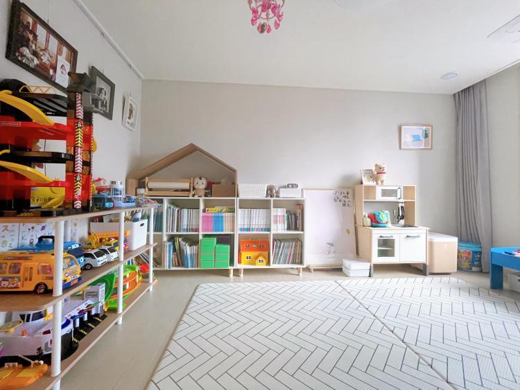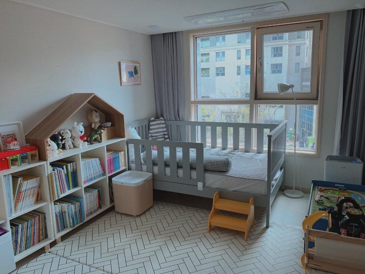 처음에 잘 하던 잠자리 분리를 아이가 너무 싫어하면서 침대를 큰 방에 합쳐버렸어요. 거실에 있던 자기 공간이 빼앗긴 만큼 아이의 공간을 더 넓혀 주었답니다. 아이가 다시 분리 수면을 할 때까진 아이의 장난감 방으로 사용할 생각이에요.