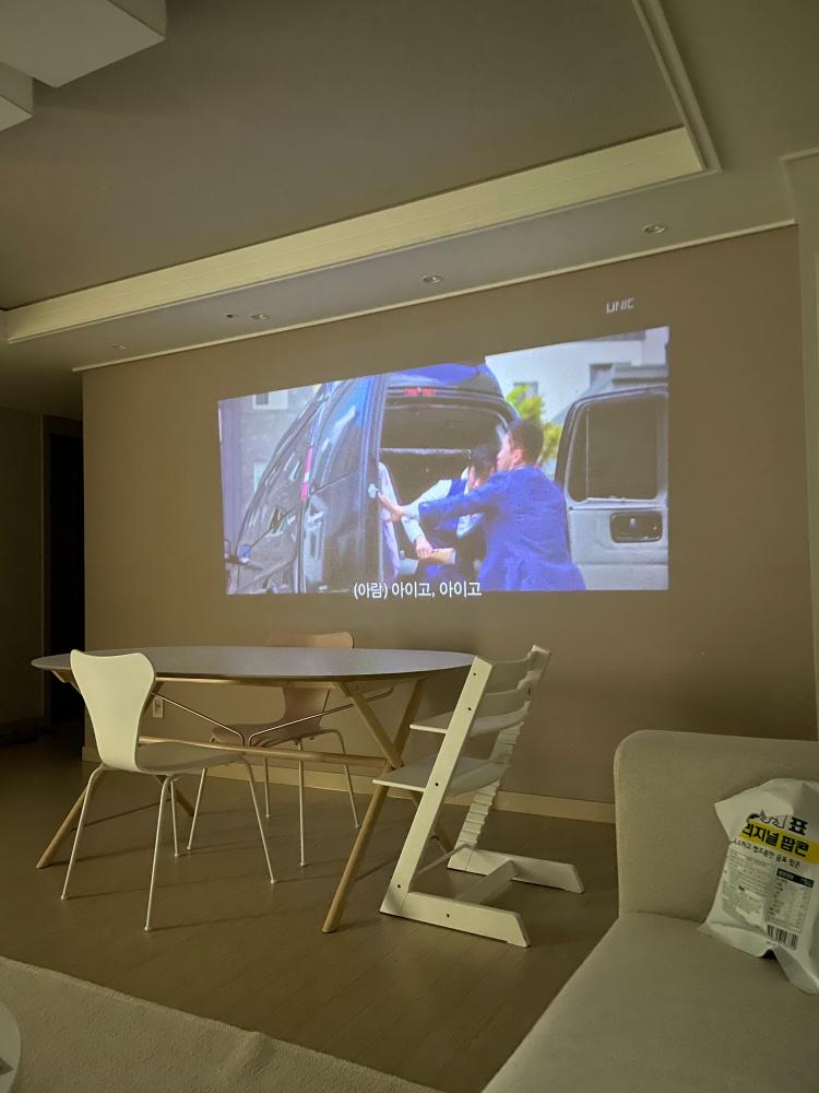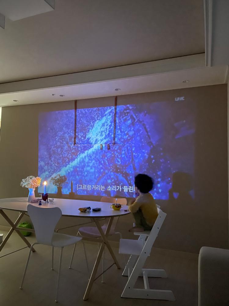 소파가 창가 쪽으로 가고 거실 벽이 생기면서 잘 사용하지 않던 빔을 꺼내왔어요. 원래는 안방에 스크린이 설치되어 있는데 잘 사용하지 않았거든요. 오래된 빔이라 화질도 좋지 않지만 저녁에 한 번씩 영화 볼만하더라고요. 가끔 티브이 대신 반대쪽 벽면으로 빔을 쏴서 넷플릭스를 즐긴답니다.